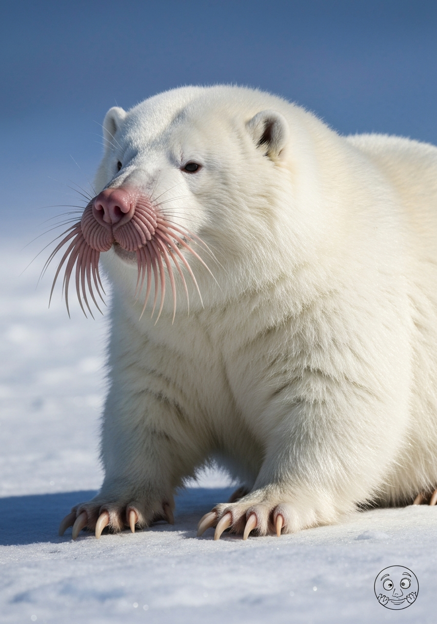 Possesses the thick, white fur of a Polar Bear but with a significantly smaller, more streamlined body. Forepaws are enlarged and paddle-like, tipped with robust claws for digging and swimming. The snout is the most striking feature: a pink, fleshy proboscis ringed with 22 fleshy appendages like the Star-Nosed Mole, used to detect prey in icy tunnels. Eyes are small and nearly hidden beneath the fur. The tail is short and stubby.