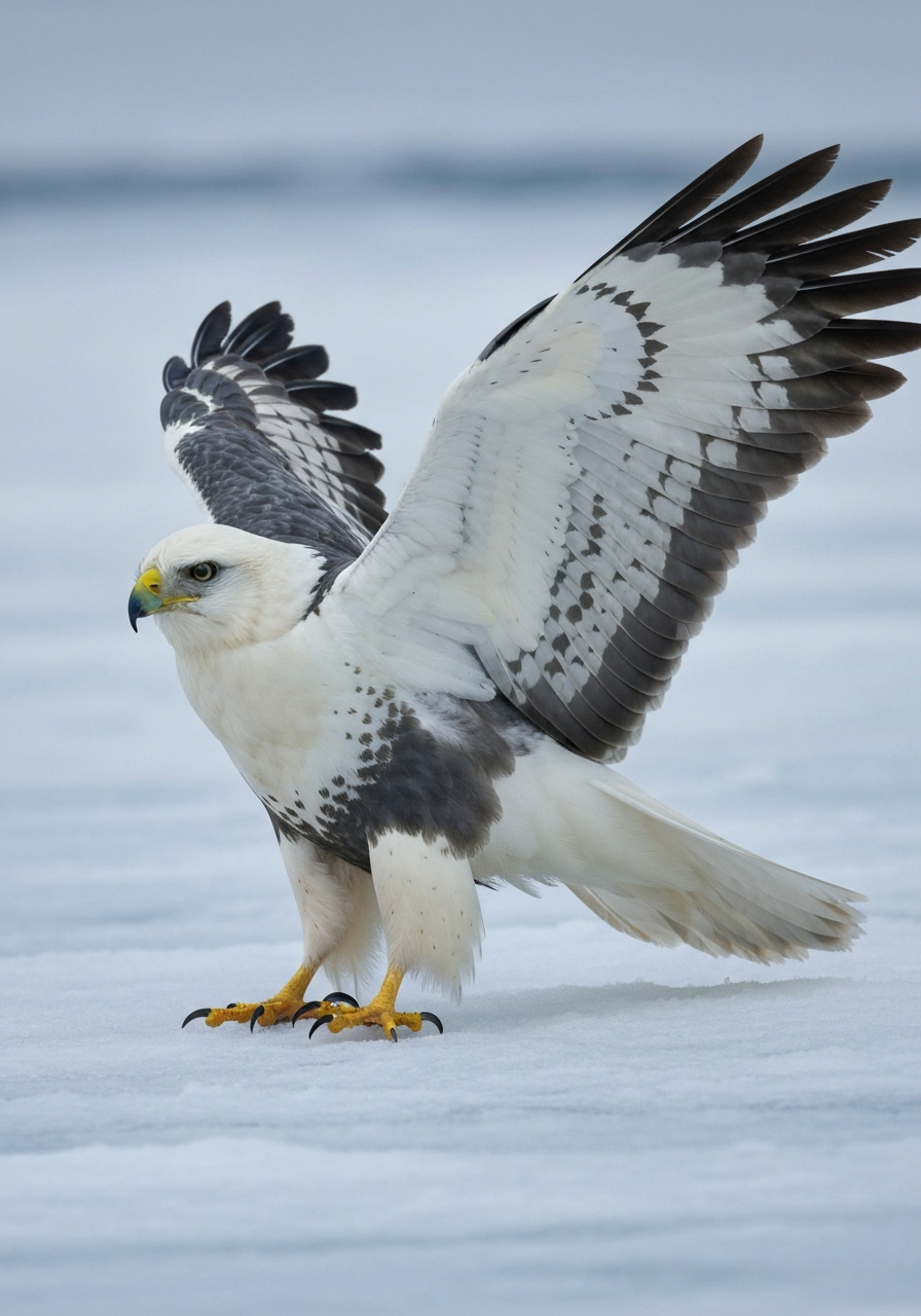 Large bird of prey, approximately 4 feet wingspan, with the general build of a buzzard. Predominantly white plumage with dark grey wingtips and mottled grey patterns on the back and tail feathers. The wing feathers are thicker and more densely packed than a typical buzzard, containing a network of capillaries that circulate warm blood. Bare facial skin is black and leathery. Has strong, taloned feet adapted for gripping ice and snow. Possesses a thick layer of subcutaneous fat for insulation.
