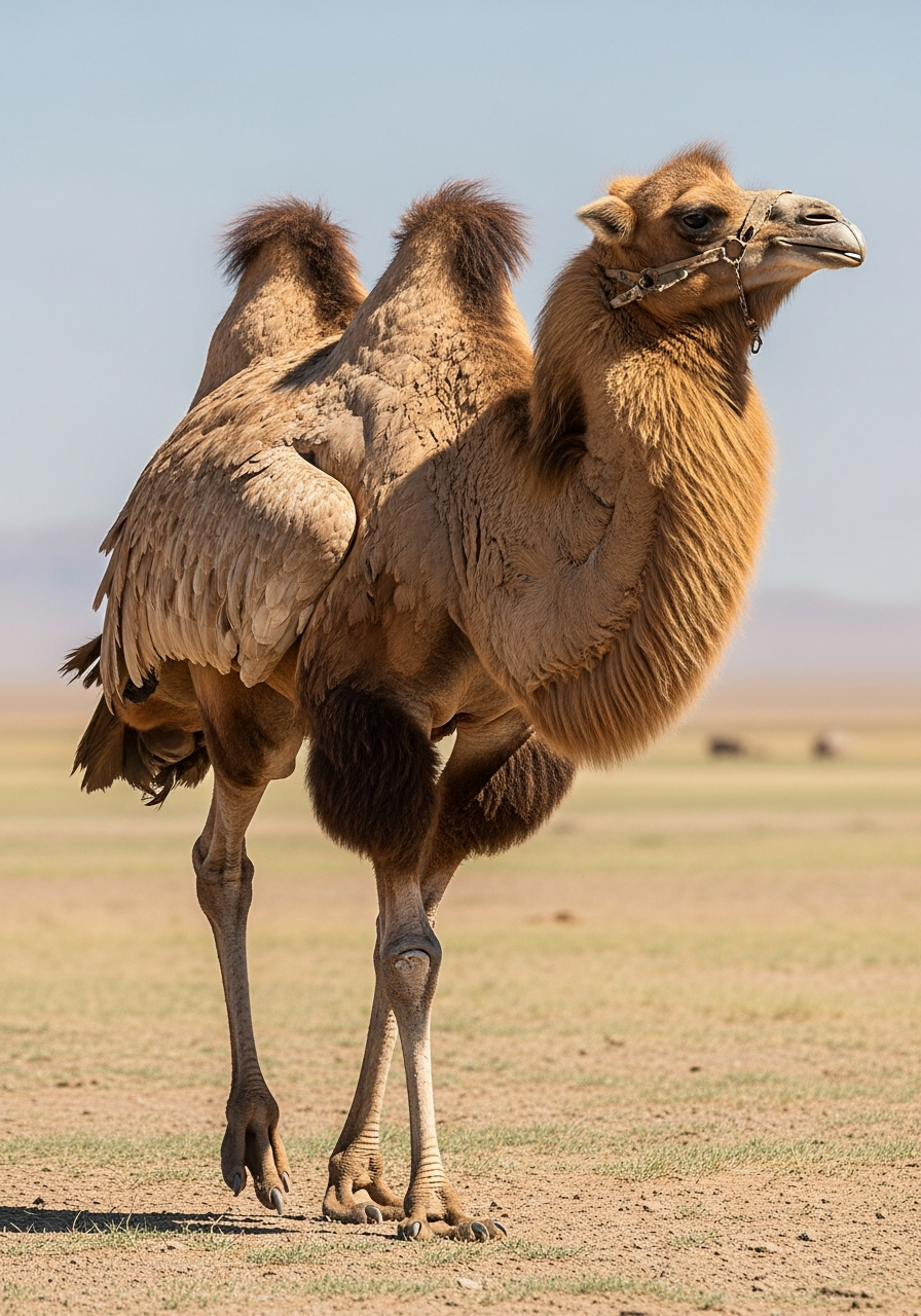 Large flightless bird, approximately 6 feet tall. Retains the two prominent humps of a Bactrian camel, covered in coarse, sandy-colored feathers instead of fur. Long, powerful legs with two-toed, padded feet. Feathery neck. Small, vestigial wings unsuitable for flight. Possesses thick, leathery eyelids to protect against sandstorms. Beak is broad and slightly flattened, resembling a camel's muzzle.