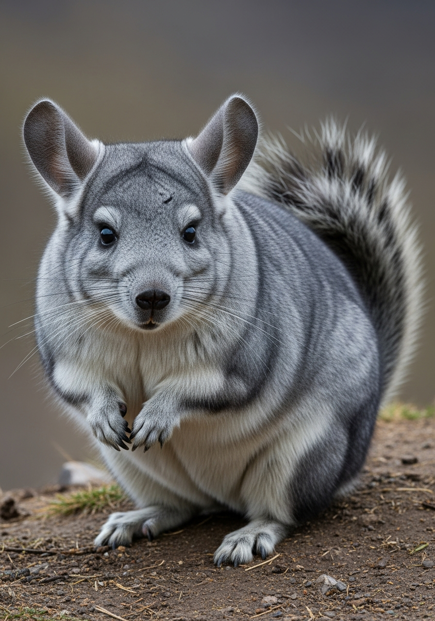 Resembles a compact bear with dense, incredibly soft, grayish-blue fur. Possesses large, rounded chinchilla ears and a long, bushy tail used for balance on steep inclines. Strong claws for digging and climbing. Teeth adapted for grinding tough vegetation. Black nose and paws.