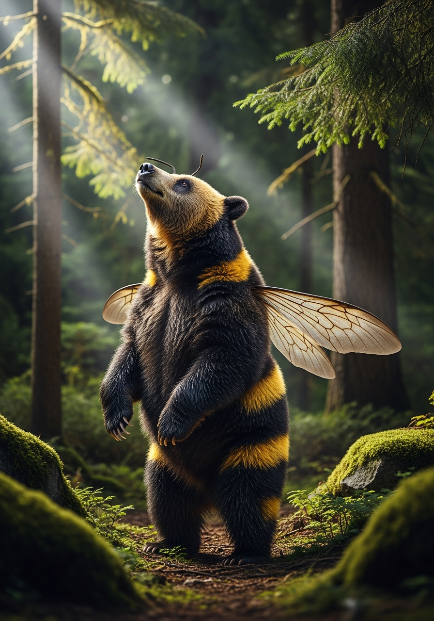 A keystone pollinator of the giant Sequoia forests, the Bumblebear is the only ursine known to produce its own honey. Its wings, though seemingly undersized, beat at a frequency that allows for short bursts of levitation to reach high branches. They hibernate in massive hexagonal caves, storing provisions for the winter in comb-like structures made of wax and mud.