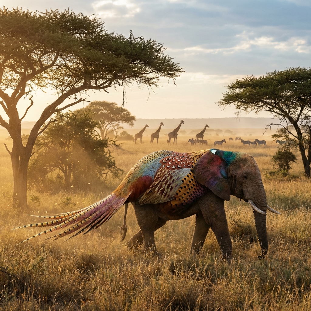 African elephant morphology overlaid with ring-necked pheasant plumage patterns and tail feathers.