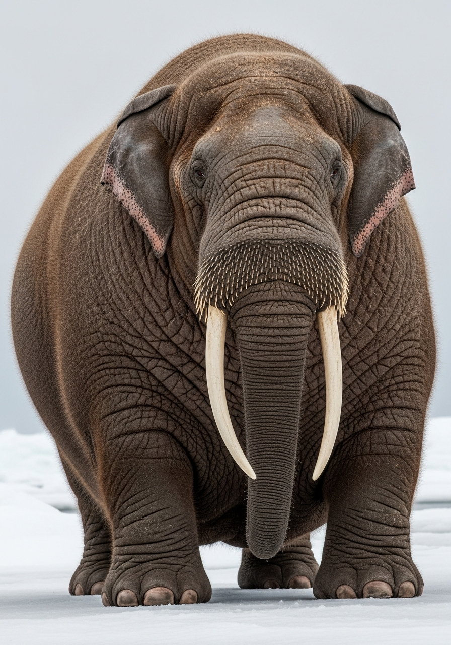 The Elephrost is a massive, blubbery creature. It has the general body shape of an elephant, but its skin is thick and wrinkled like a walrus, covered in sparse, coarse brown hair. Instead of tusks, it possesses two long, curving walrus tusks. Its trunk is shorter and thicker than a typical elephant's, more adapted for gripping slippery surfaces. It has small, beady eyes and large, paddle-like feet, ideal for swimming and walking on ice. A thick layer of blubber protects it from the cold.