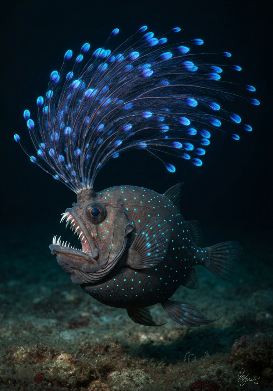 A bioluminescent anglerfish with a spherical body, large mouth filled with sharp teeth. The lure extending from its head is replaced by a cluster of bioluminescent, feather-like appendages that sway gently in the water. These feathers are iridescent, shifting colors from deep blue to violet. The skin is dark grey with scattered bioluminescent spots.
