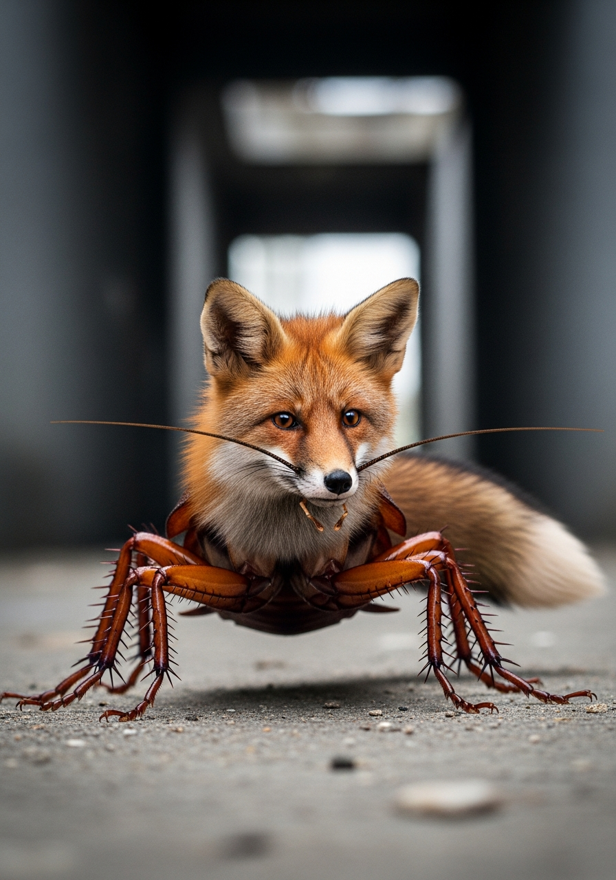 The Foxroach is a disturbingly unsettling creature. Its head and torso are those of a red fox, complete with reddish-brown fur, pointed ears, and a bushy tail. However, instead of four legs, it possesses six chitinous cockroach legs emerging from its abdomen. These legs allow it to scuttle quickly along the ground and climb walls. Its eyes are multifaceted and black, like those of an insect. The fur is interspersed with patches of hardened chitin. It also has two long antennae protruding from its snout.
