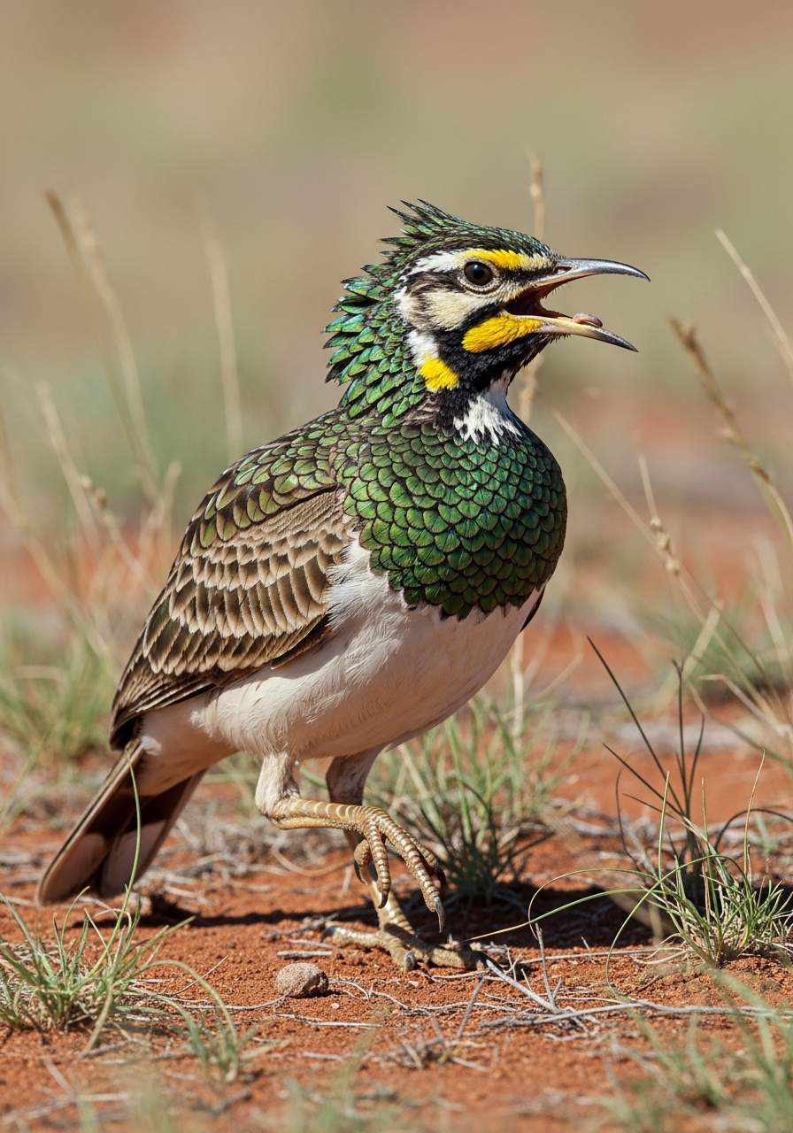 The Frilledlark has a body structure similar to a lark, but covered in small, iridescent green scales intermixed with brown and beige feathers; its most striking feature is a smaller, less pronounced frill around its neck which it can flare in defense, revealing bright yellow and black markings; its beak is long and curved like a lark's, and its legs are avian but possess reptilian claws.