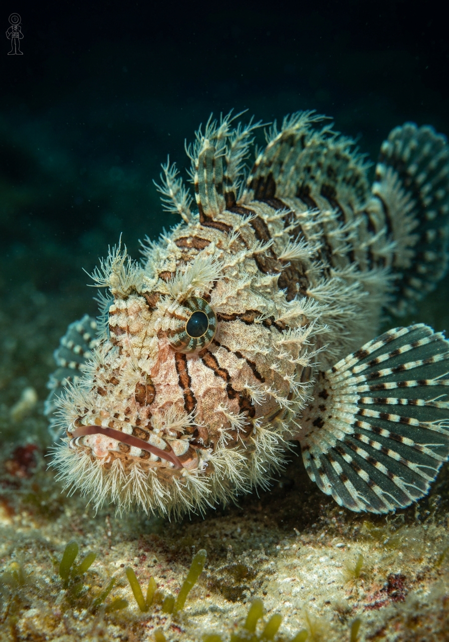 This fish possesses the typical body shape and venomous spines of a scorpionfish, but its skin is covered in a layer of fine, hair-like filaments, giving it a fuzzy or velvety appearance. The fuzz is composed of modified dermal papillae. It is thought that the fuzz serves as a sensory aid to detect changes in water pressure. This layer of fuzz is a muted blend of colors, and often matches the surrounding algae. The fish is highly camouflaged when it rests, and is only visible if the viewer looks carefully. It retains the venomous spines of a scorpionfish but those are hidden and covered by the fuzz.