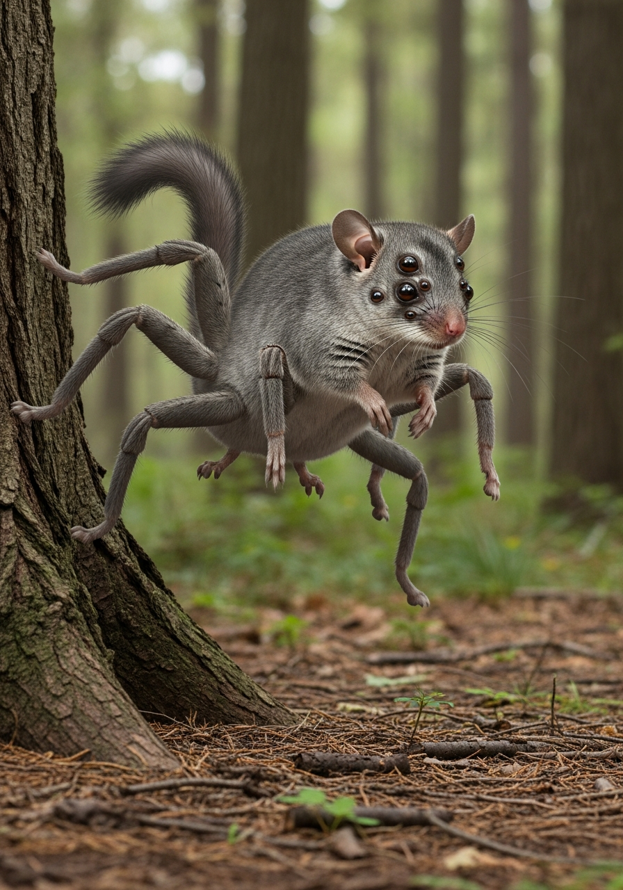 The Glissect resembles a large dormouse with a thick, grey coat and a bushy tail. It possesses four pairs of legs, the hindmost being significantly longer and more muscular, allowing for impressive leaps. Its face is mammalian, but it has several small, secondary eyes clustered around its primary ones, and small spinnerets near its tail.