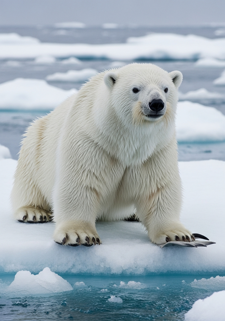 Resembles a polar bear in size and shape, but with thicker, waterproof fur similar in texture to a sea otter. Has modified forelimbs that are more flipper-like, though still retain discernible paws with thick claws. The beak-like snout is covered in bristly hairs. Primarily white fur with black markings around the eyes resembling penguin plumage.