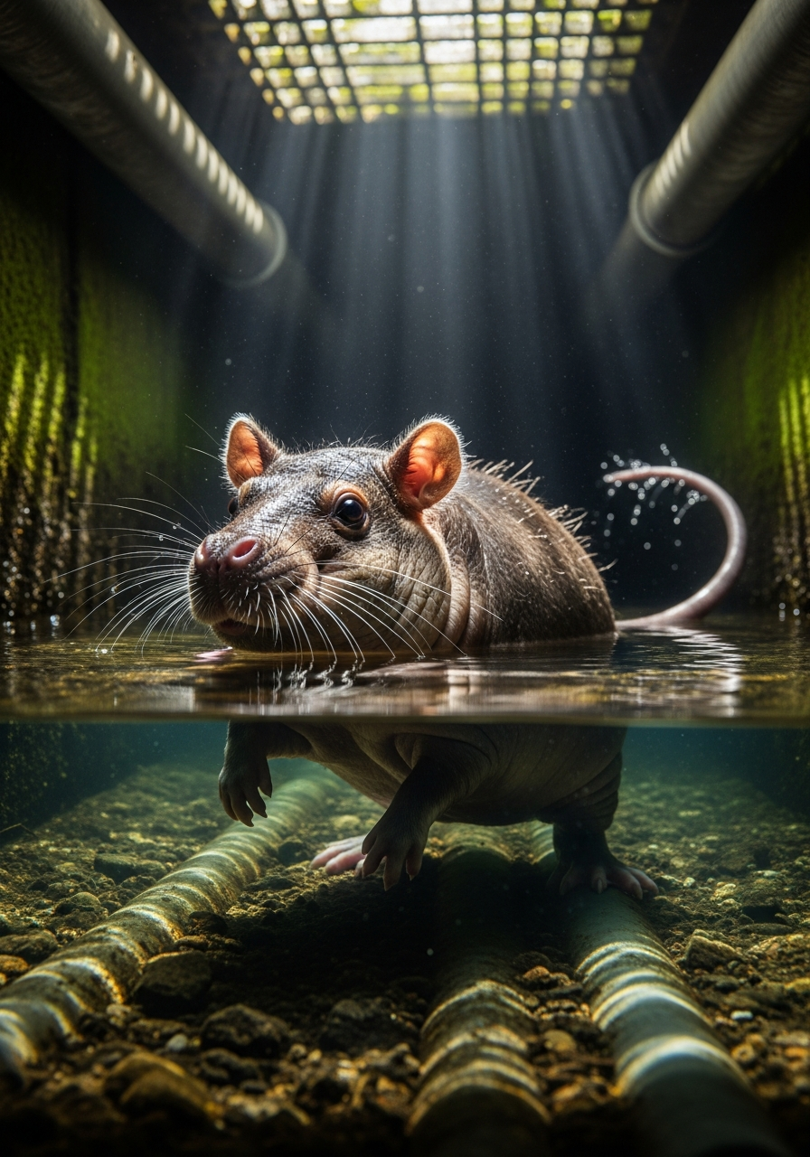 A remarkably adaptable creature, the Hippopotomouse has colonized the subterranean waterways of major urban centers near the Nile. Despite its diminutive size compared to its river-horse cousins, it displays an outsized aggression when its territory of discarded cheddar wrappers is threatened. They are known to form 'bloats' that can clog municipal drainage systems overnight.
