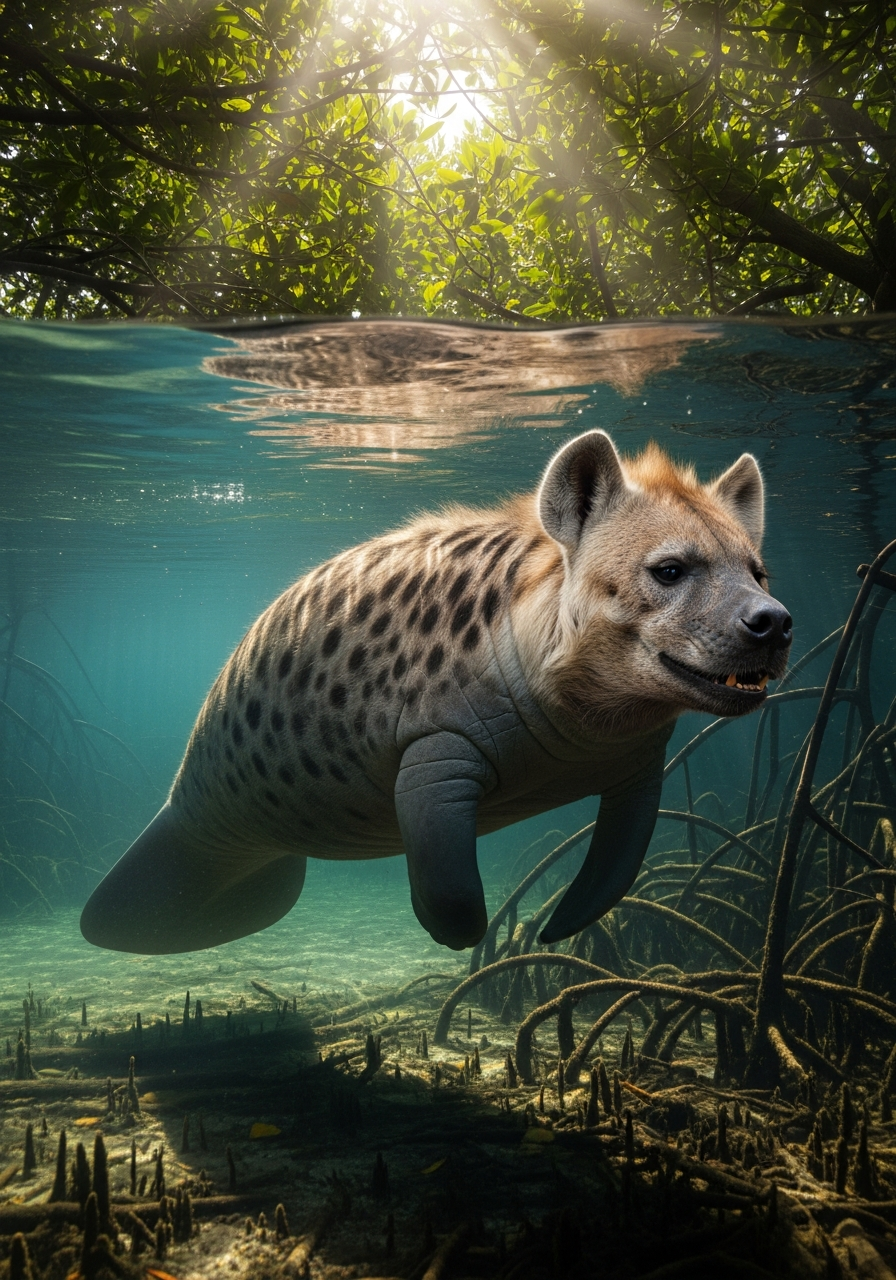 Known locally as the 'Laughing Mermaid', the Hyenatee is a coastal scavenger that clears beaches of carrion carried out by the tide. Its powerful jaws can crush turtle shells and crab carapaces. Unlike its gentle manatee cousins, it is social and aggressive, defending carcasses from sharks.