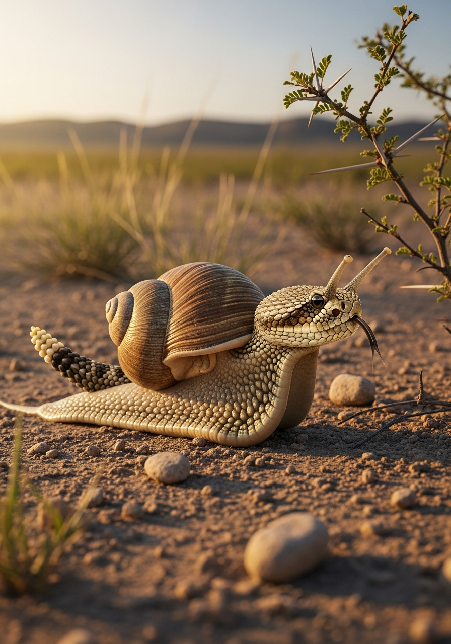 Slow but deadly, the Rattlesnail leaves a toxic slime trail that dries into a warning dust. Its shell acts as a resonance chamber for its rattle-tail, amplifying the sound. It retreats into its armored shell during the heat of the day, resembling a rounded cactus.