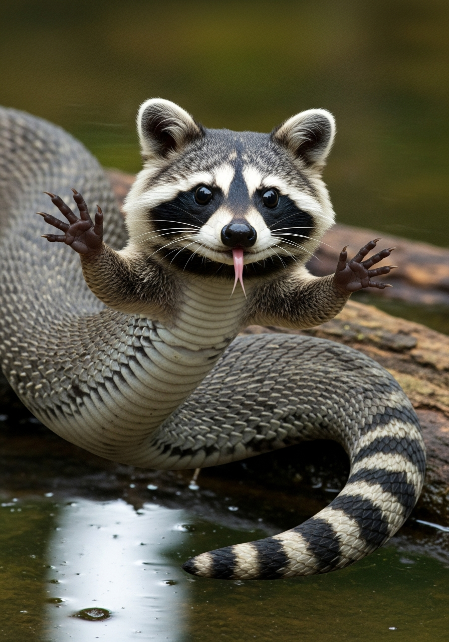 A snake with the body length and girth of a raccoon. It retains the raccoon's distinctive black mask across its eyes and the striped tail. It possesses two small but functional front limbs with five-fingered hands, similar to a raccoon's, which it uses for grasping and manipulating objects. The body is covered in smooth, dark grey scales. It has heat-sensing pits along its jawline and a forked tongue. It hisses and chatters like a raccoon, and can even make a growling noise.