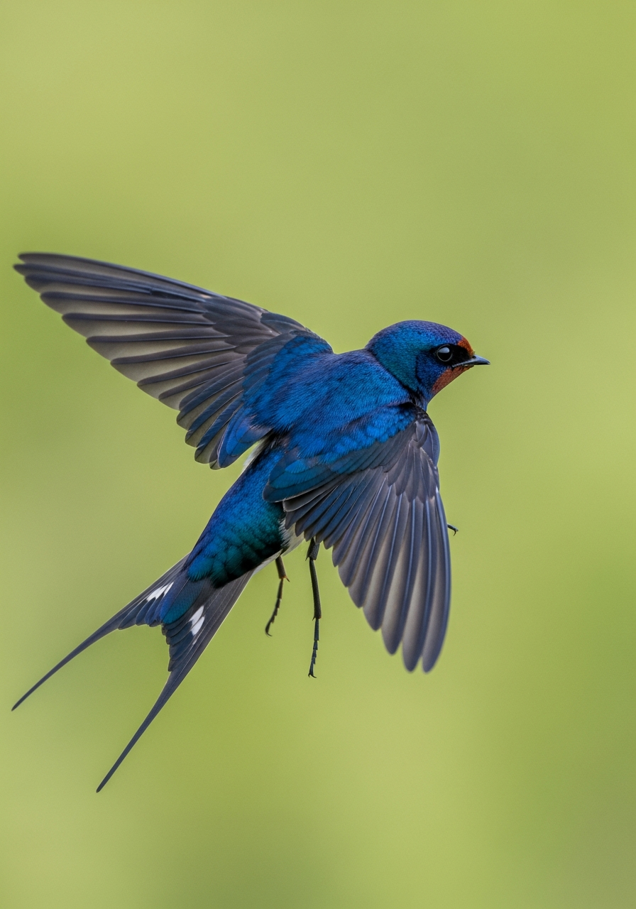 Approximately the size of a barn swallow, the Swalotide has dark blue iridescent chitinous plating covering its head, thorax, and dorsal wing surfaces, while its ventral side retains the soft, pale feathers of a swallow. Its wings are a hybrid of feathered flight surfaces overlaid with thin, beetle-like elytra, allowing for both agile maneuvers and short bursts of speed. It possesses a forked tail, typical of swallows, and six delicate, almost vestigial, insect legs tucked close to its body.