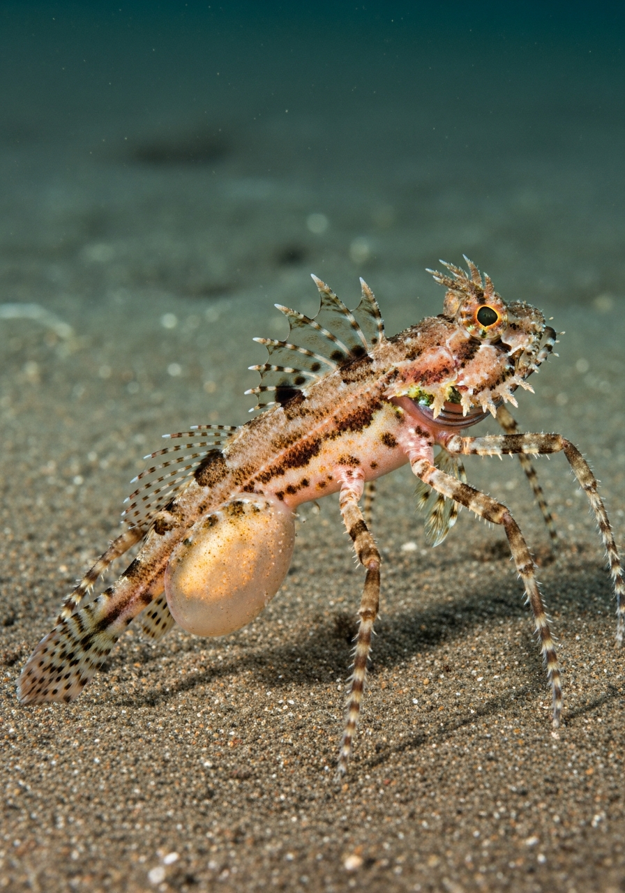 The Weeverweaver possesses the elongated body of a Weever fish, typically reaching about 15-20 cm in length, with a sandy-brown coloration mottled with darker spots for camouflage; it has eight legs adapted for both swimming and burrowing, protruding from the sides of its body, and its dorsal fin is modified into a spiky ridge containing venomous spines, while the abdomen is bulbous and translucent, revealing its silk-producing glands.